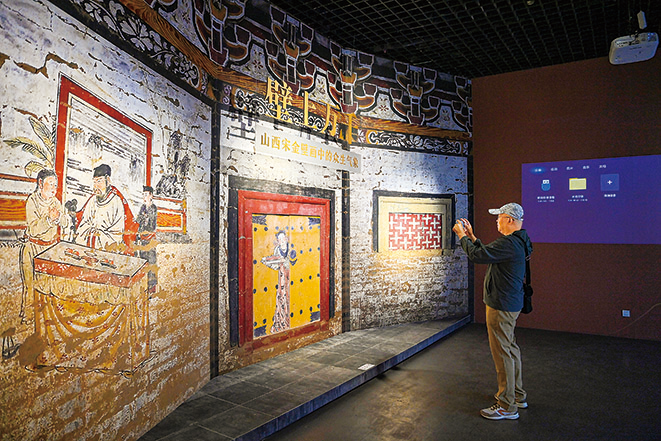 在山西博物院,游客在“壁上萬(wàn)千——山西宋金壁畫(huà)中的眾生氣象”展覽上拍照(2024年5月16日攝)。記者 楊晨光 攝