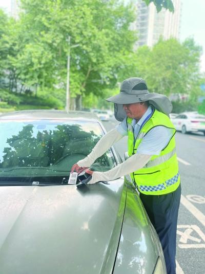 7月31日,南京最高氣溫又輕松越過(guò)了38℃,下午3時(shí)后,盡管氣溫開(kāi)始掉頭向下,但馬路上還是熱浪翻滾,三牌樓大街停車收費(fèi)員曹文磊仍如平時(shí)一樣耐心地指揮著每一位停車人,“方向盤向右打死,掛倒擋,走……”曹文磊手、嘴并用,烈日下的他滿臉通紅、大汗淋漓。當(dāng)車輛按方向停進(jìn)泊位內(nèi)后,他隨即拿出打單機(jī)、車輛信息系統(tǒng)錄入機(jī)進(jìn)行停車收費(fèi)的相關(guān)操作,邊操作邊眼看四方,“那邊又有一輛車來(lái)了?!彼杆仝s過(guò)去進(jìn)行打單、拍照等一系列同樣操作。
