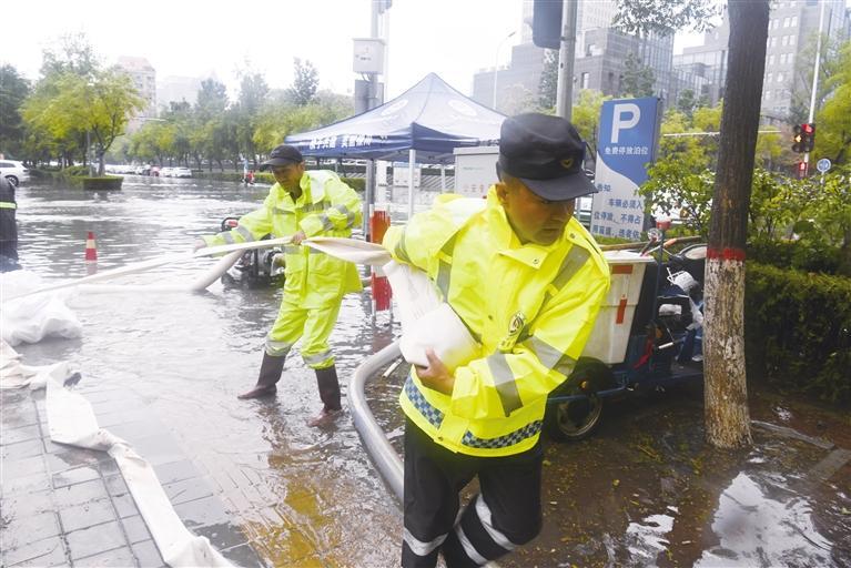 8月8日,銀川市金鳳區(qū)尹家渠北街與宜居巷交叉口路面積水嚴(yán)重,金鳳區(qū)綜合執(zhí)法局上海西路執(zhí)法中隊(duì)人員搬運(yùn)潛水泵、消防栓等抽排水工具排水保暢。 記者 白茹 攝