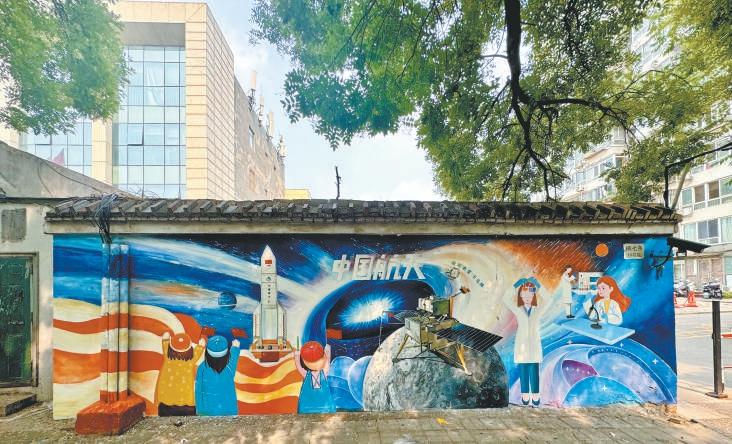 在地球和月球交相輝映的背景中,左側(cè)是火箭直沖云霄,右側(cè)是夜以繼日研究月壤的科學(xué)家們,中間主畫面是嫦娥六號登陸月背……在東鐵匠營街道橫七條的墻面上,是北京市第十八中學(xué)實(shí)驗(yàn)學(xué)校許格老師帶著學(xué)生繪制的《宇宙漫想》2.0版。