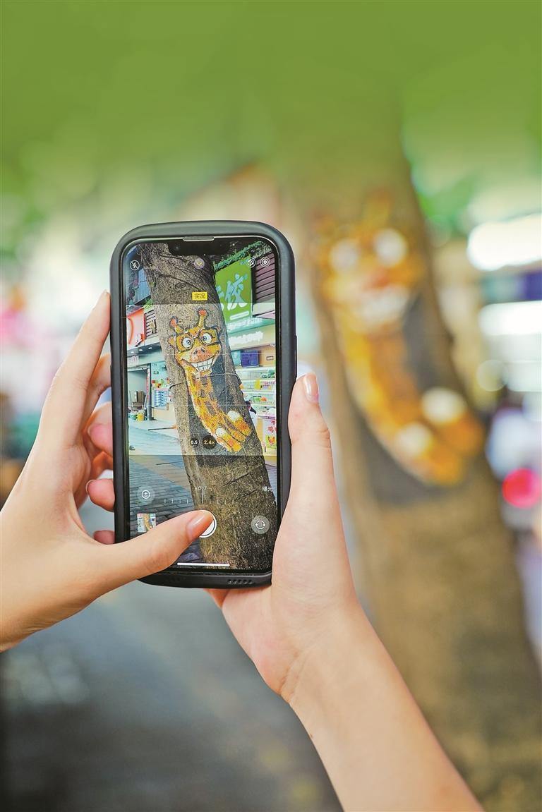單手倒立的小獅子、向外窺探的貓頭鷹、笑嘻嘻的長頸鹿……盛夏,在羅湖區(qū)筍崗街道田貝社區(qū),綠樹成蔭的街道兩旁,藏匿著各種憨態(tài)可掬的“小動物”。這一幅幅惟妙惟肖、多姿多彩的創(chuàng)意樹繪構成了一道獨特風景線,給路過的行人帶來一份視覺驚喜,成為市民“打卡”的城市文化新街景。