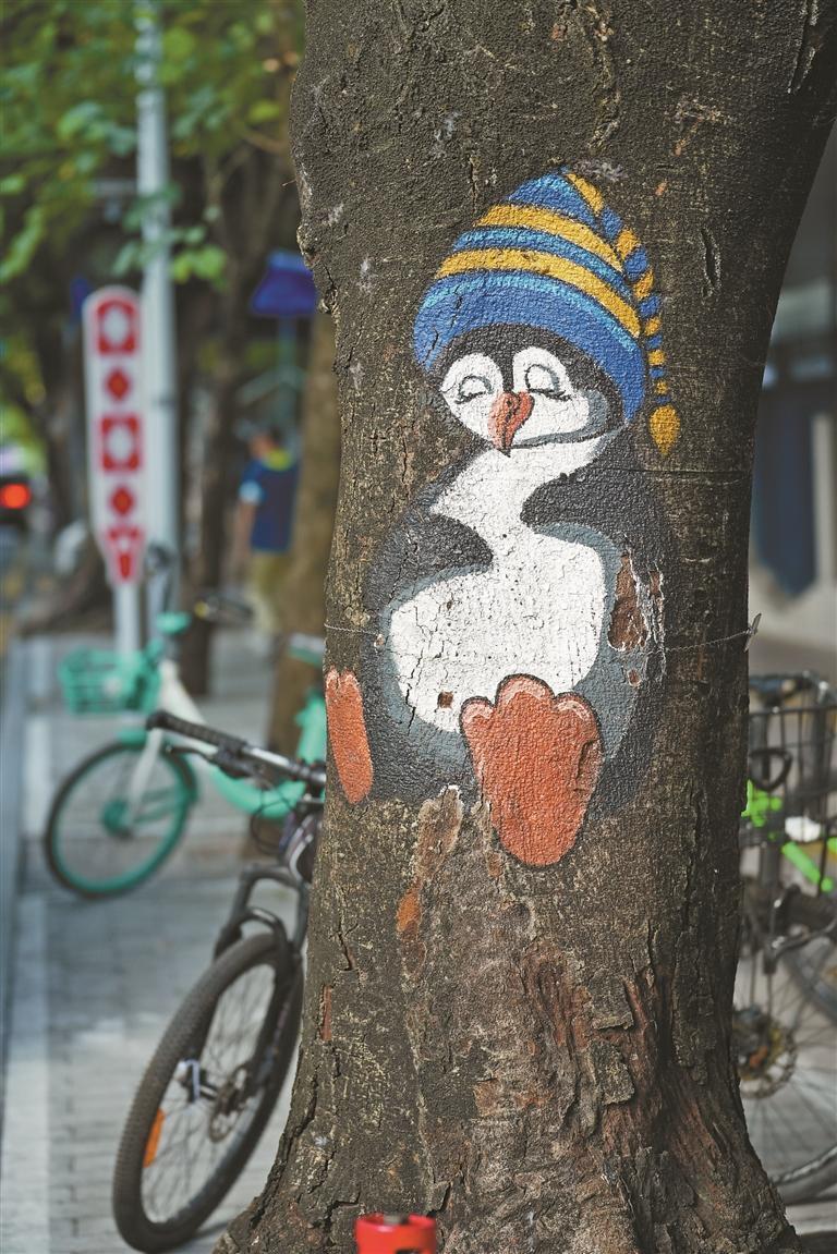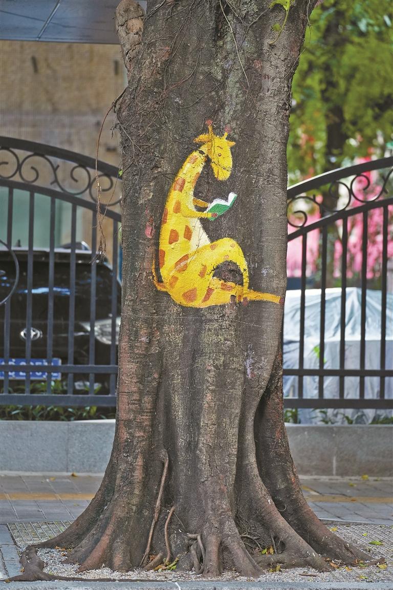 涂鴉正成為社區(qū)文化的新元素。在圓嶺百花二路深圳實驗學校(小學部)前的樹干上,有一只拿著書卷、戴著“博士帽”的貓咪和靜靜讀書的“長頸鹿”,當放學的學生們在此路過,畫面和諧而溫馨。