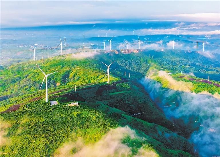 8月6日,河南省宜陽縣錦屏山生態(tài)園,滿山翠綠映襯著一臺臺新能源風力發(fā)電機。該縣立足生態(tài)優(yōu)先、綠色發(fā)展理念,建造了27000畝人造森林公園,把昔日荒山打造成可持續(xù)循環(huán)發(fā)展的綠色經濟帶。田義偉 攝(中經視覺)