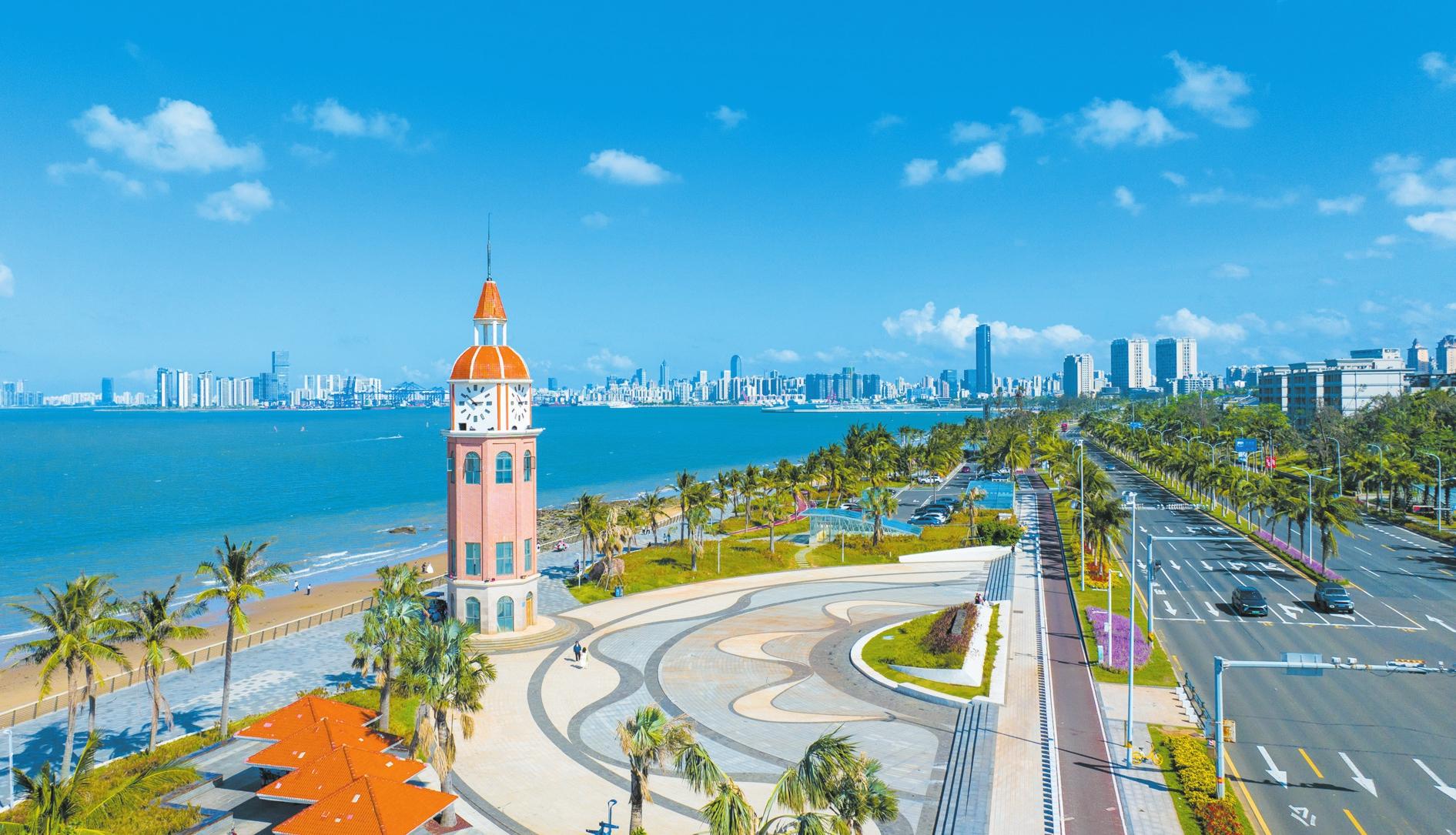 圖為10月20日,遠(yuǎn)眺濱海大道,水天相接,岸邊的沙灘、鐘樓、椰林融為一體,相映成趣,椰城海口的濱海美景一覽無(wú)遺。記者 楊忠凱 攝
