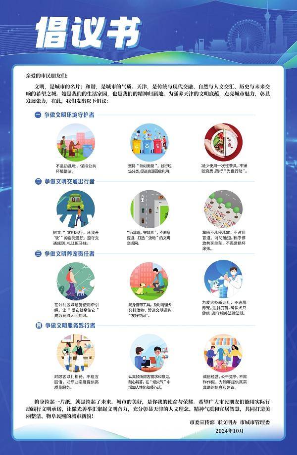 “俯身撿起一片紙,就是撿起了未來。城市的美好,是你我的使命與榮耀?!碧旖蚴形麄鞑俊⑹形拿鬓k、市城市管理委10月29日向全市發(fā)出倡議,號召人人爭做文明環(huán)境守護者、文明交通出行者、文明養(yǎng)寵責任者、文明服務踐行者,以自身的文明行為充分彰顯天津的人文理念、精神氣質(zhì)和宜居智慧,共同打造美麗整潔、物阜民熙的城市新貌。
