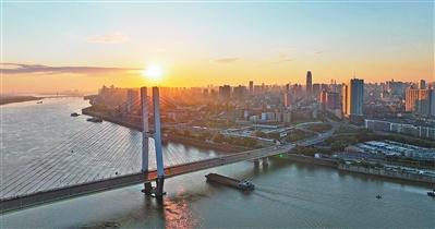 南昌市八一大橋和贛江兩岸的城市建筑群沐浴在深秋的晨光中。易江然子 攝