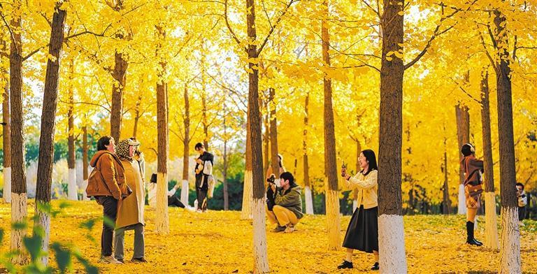 11月3日,市民游客在北京奧林匹克森林公園銀杏林樂(lè)享秋日美好時(shí)光。