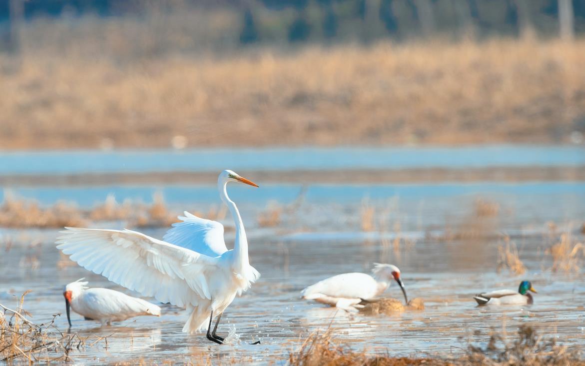 1月5日,朱鹮和白鷺等鳥(niǎo)類在咸陽(yáng)市細(xì)柳營(yíng)濕地覓食。2024年10月,24只朱鹮在此野化放飛,目前它們已基本適應(yīng)這里的環(huán)境。周季 攝