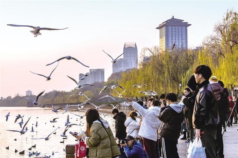1月1日,在漢中市天漢濕地公園,覓食嬉戲的紅嘴鷗吸引眾多市民游客拍照打卡。何祥弘 攝