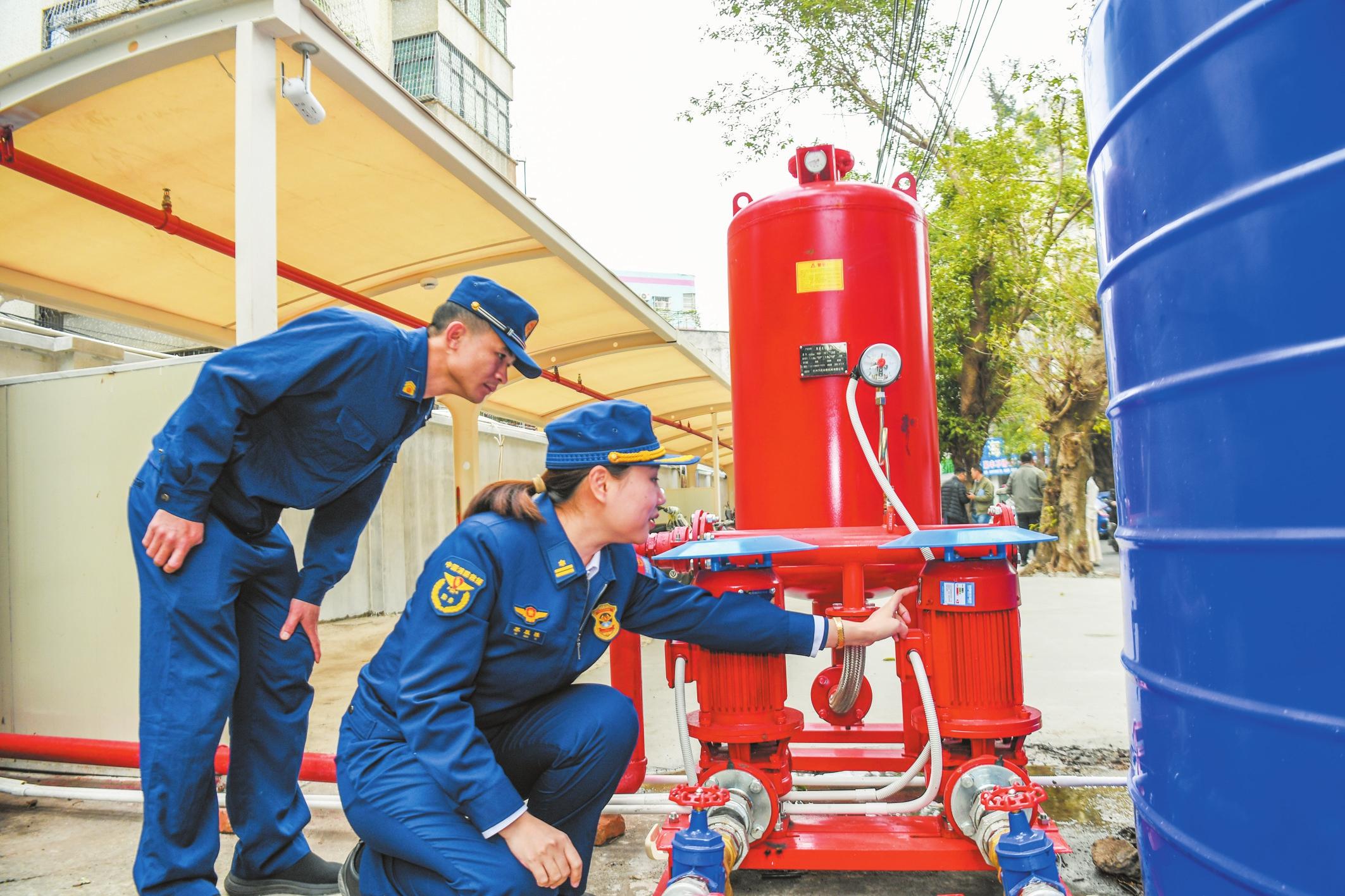在海口市龍華區(qū)秀英村社區(qū),消防人員正在檢查新建電動自行車棚的自動滅火裝置。記者 康登淋 攝