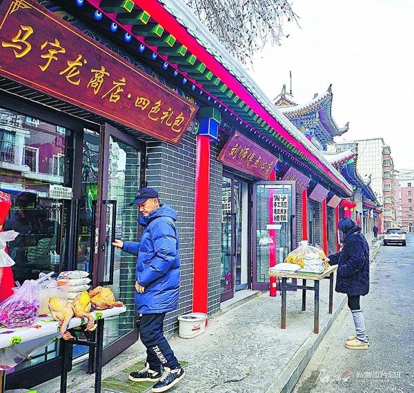 烏魯木齊市永和巷按照中式仿古建筑風格改造,既保留了老街的歷史韻味,又賦予其現(xiàn)代審美。圖為1月6日,居民在永和巷選購商品。