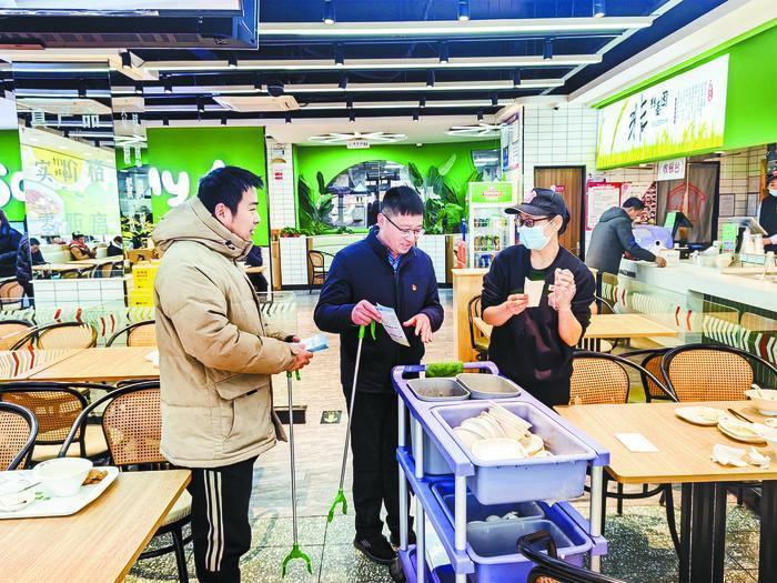 圖為網(wǎng)格員在餐飲門店中發(fā)放宣傳彩頁(yè)。