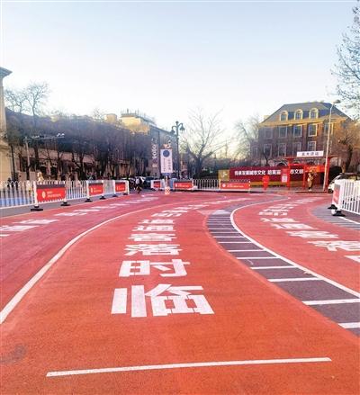 “年輕人偏愛網(wǎng)約車,又是出游的主要群體。以前每逢節(jié)假日,總會(huì)出現(xiàn)車輛擁堵、秩序混亂的場景,尤其是交通管制時(shí),河北路與成都道交口處常常因?yàn)闋I運(yùn)車的隨意??慷萑氚c瘓。我們多次調(diào)研,研究出設(shè)置臨時(shí)落客區(qū)的舉措?!敝ш?duì)負(fù)責(zé)人介紹,該區(qū)域共設(shè)置了3條臨時(shí)落客通道,地面刷著紅漆,印有“臨時(shí)落客通道,即停即走”的字樣,車道用白色圍欄隔開,車輛互不影響,圍欄上也掛有提示牌“車道擁堵,請司機(jī)師傅勿在此長時(shí)間停留”,路邊立有一個(gè)崗?fù)?,這是游客上下車等待區(qū)域。