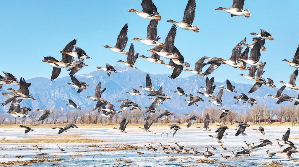 近日,延慶野鴨湖濕地自然保護區(qū)內,成群結隊的大雁從遠方歸來,在冬雪殘冰與藍天碧水交織的奇幻世界中翱翔、嬉戲,為這片靜謐的濕地帶來一抹初春的靈動與生機。馬文曉 攝