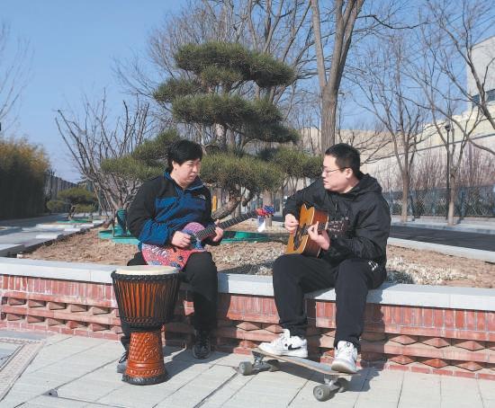 兩位音樂(lè)愛(ài)好者在臺(tái)湖舞美藝術(shù)中心口袋公園內(nèi)彈奏樂(lè)器。聶堂明攝