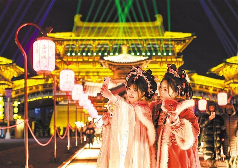 2月12日,身著漢服的游客在河南省洛陽市隋唐洛陽城九洲池神都上元燈會(huì)游園賞燈。張光輝 攝(中經(jīng)視覺)