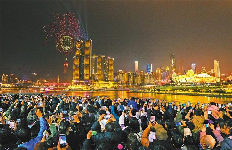 2月11日,重慶,市民在長江邊觀看無人機(jī)表演。重慶的“無人機(jī)燈光表演”將科技創(chuàng)新融入傳統(tǒng)節(jié)日,不僅呈現(xiàn)出視覺盛宴,也為假日消費(fèi)增添了新動(dòng)能。劉嵩 攝(中經(jīng)視覺)