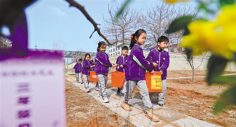 3月11日,山東省青州市南湖學(xué)校勞動(dòng)實(shí)踐基地,小學(xué)生提水澆灌新栽植的樹(shù)木。王繼林 攝(中經(jīng)視覺(jué))