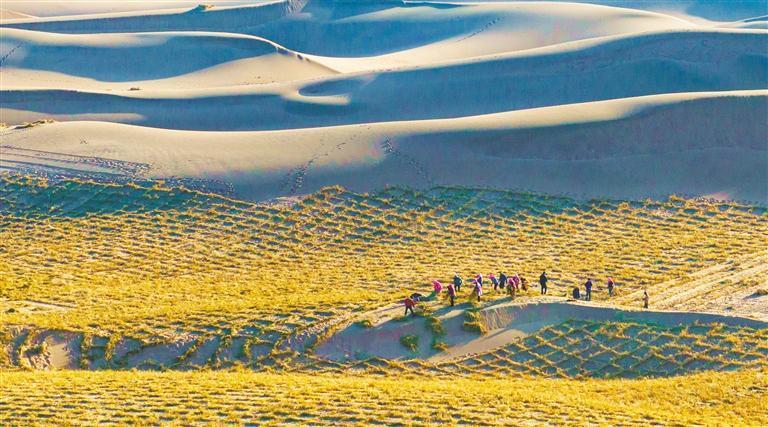 今年3月12日是我國(guó)第47個(gè)植樹(shù)節(jié)。3月8日,甘肅省張掖市臨澤縣北部沙漠治沙區(qū),治沙員在埋設(shè)草方格沙障。楊永偉 攝(中經(jīng)視覺(jué))