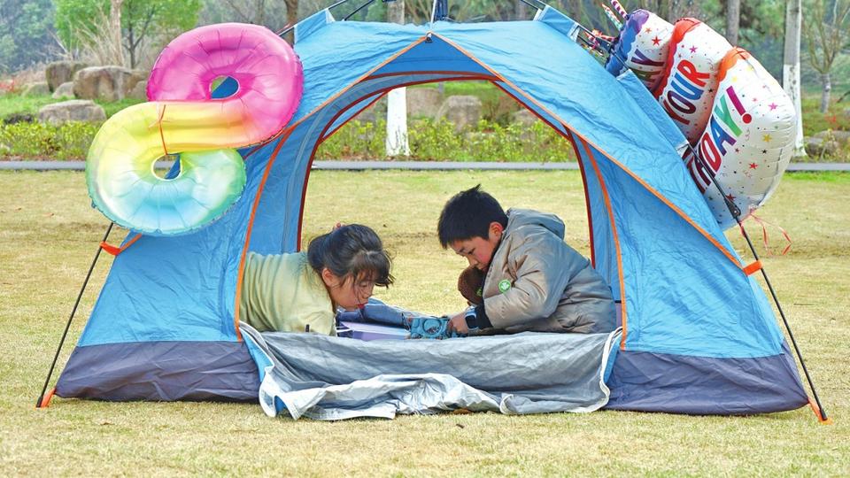 3月16日,在浙江省嘉興市植物園,小朋友在露營帳篷內(nèi)看書。春回大地,人們紛紛走出家門,享受戶外活動(dòng)的樂趣。從商場超市的露營商品專區(qū),到遍布城鄉(xiāng)的露營基地、公園綠地,“露營經(jīng)濟(jì)”悄然升溫。(圖片均據(jù)新華社)
