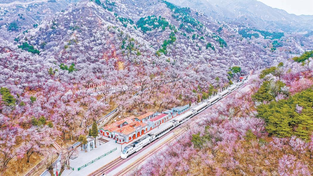 北京市郊S2線(xiàn)鐵路穿梭在爛漫花海間,給進(jìn)京旅客留下美好的“北京第一印象”。記者 潘之望 攝
