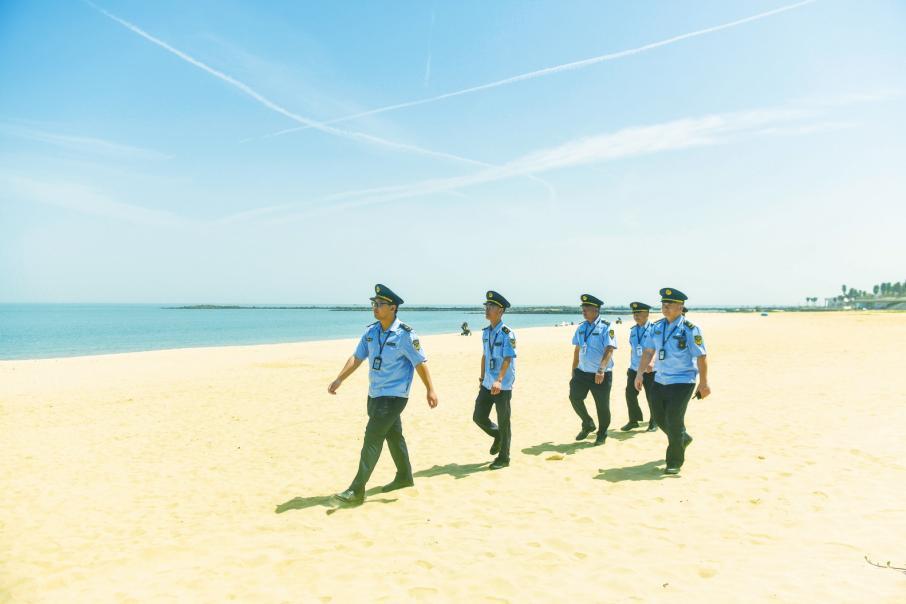 消博會(huì)期間,海口市綜合行政執(zhí)法局海洋和漁業(yè)行政執(zhí)法支隊(duì)執(zhí)法人員巡查會(huì)展中心周邊沙灘。