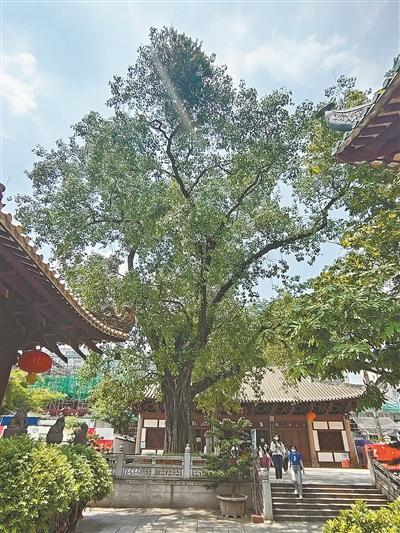 到了宋代,“光孝菩提”被列為“羊城古八景”之一。如今,六祖殿前,菩提榕生機勃勃,樹影婆娑。需要指出的是,今日光孝寺的菩提榕并非千年前的首棵菩提榕。這里另有故事。清嘉慶年間,智藥三藏手植的菩提榕被大風刮倒,搶救無效。寺僧從南華寺取菩提榕枝條植于光孝寺。兩地菩提榕本出一脈,南華寺的菩提榕是早期從智藥三藏手植的菩提榕上取枝條種植而成的,系“子枝”;如此,今日光孝寺的菩提榕可謂是“孫枝”。