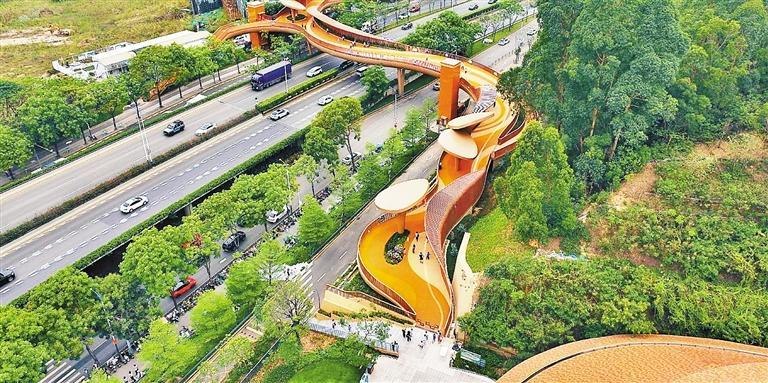 在目前深圳占地面積最大的兒童公園——龍崗兒童公園,門口飄來(lái)一條靚麗“彩帶”。這座人行天橋是公園的配套連接通道,橫跨公園門口的主干道鹽龍大道,將公園與周邊的商圈連通起來(lái),實(shí)現(xiàn)“無(wú)縫”連接。帶著孩子到公園玩的胡先生表示,以前從商圈到公園需要等紅綠燈,過(guò)街時(shí)人群也比較雜亂,如今有了天橋,可以輕松到達(dá)公園門口,這么漂亮的天橋孩子們也很是喜歡。