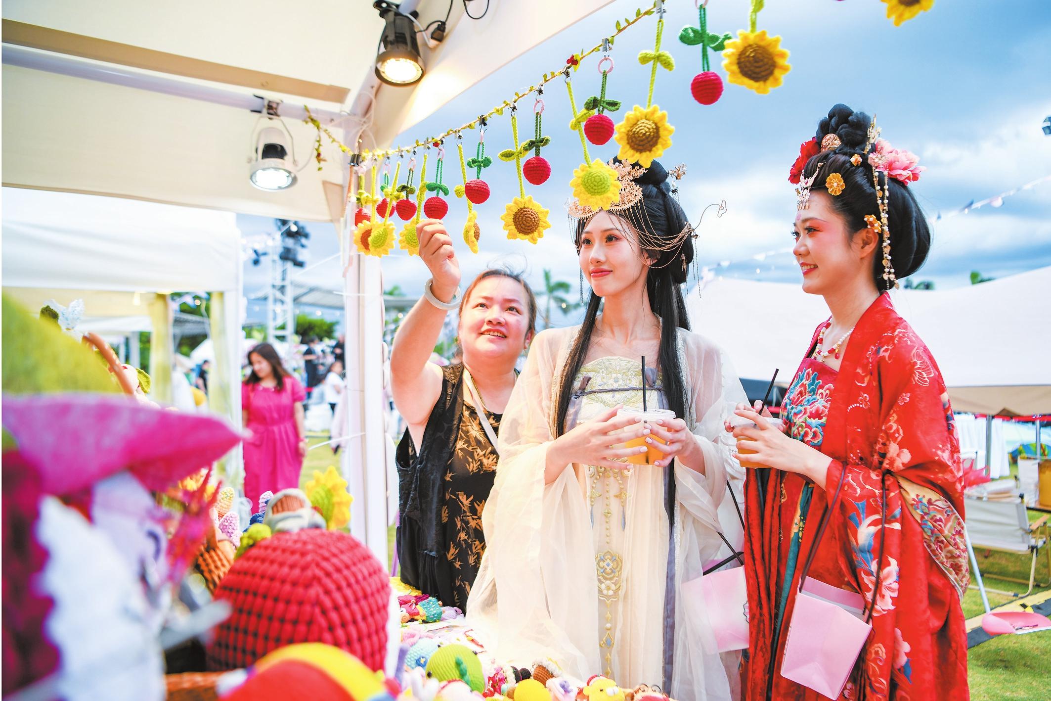 身穿傳統(tǒng)服飾的市民在2025椰城香見(jiàn)·??诨鹕嚼笾ο娜帐屑腺?gòu)物,臉上洋溢著幸福的笑容。記者 蘇弼坤 攝