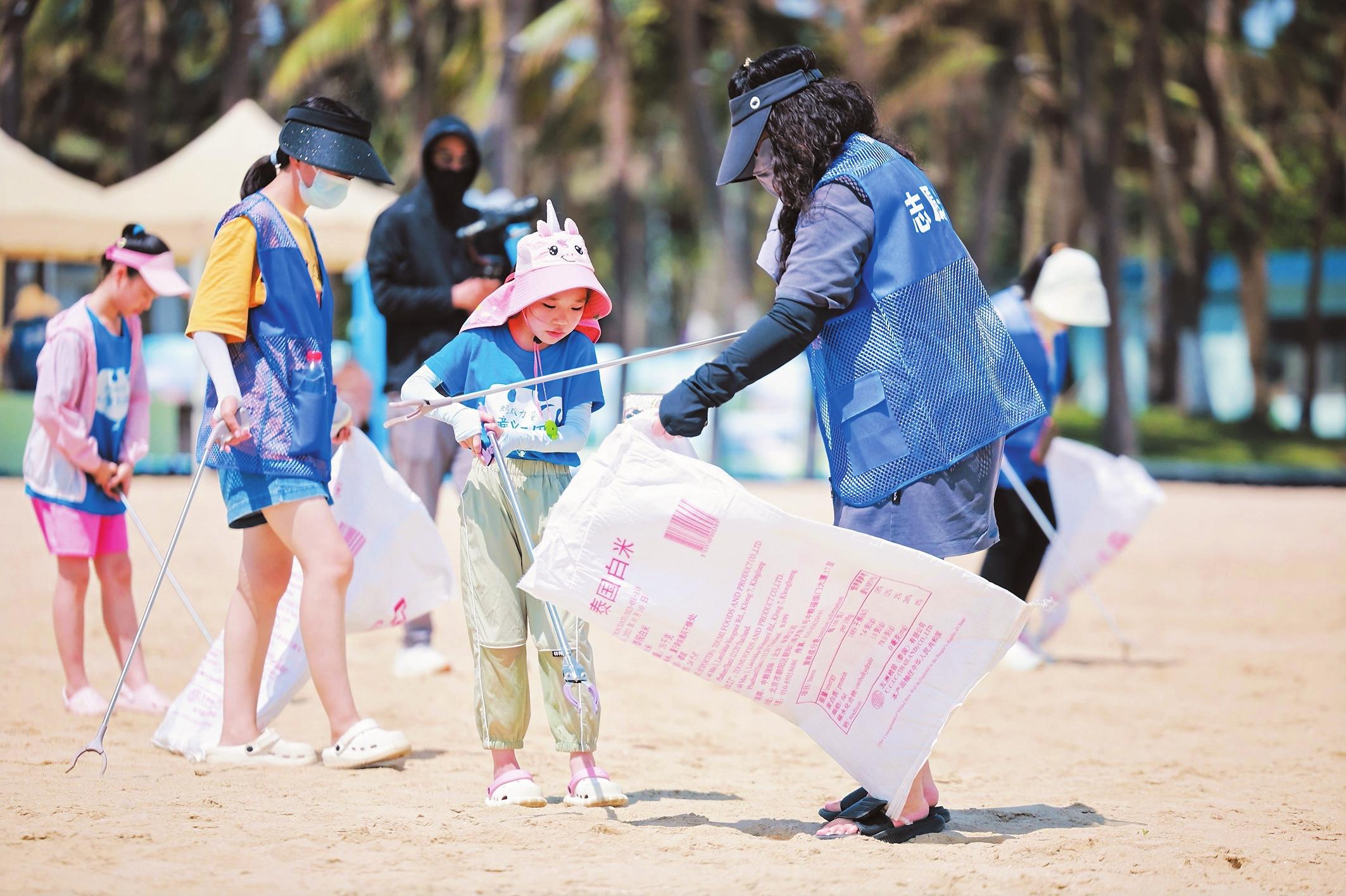志愿者在海口假日海灘岸線上收集垃圾,清潔海灘,志愿者的自覺(jué)行為,刷新著城市文明的觀感。記者 孫士杰 攝