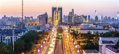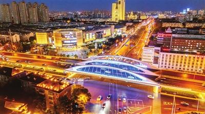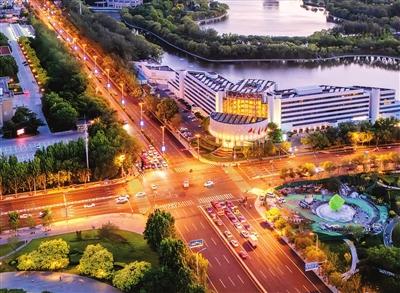 夜幕降臨,天津市友誼路沿線燈火璀璨,水晶宮飯店、津誼橋、蓮花酒店等地標建筑披上絢麗的光影外衣。
