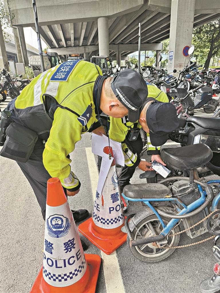 為進(jìn)一步優(yōu)化地鐵站口周邊交通秩序,交警部門在常態(tài)化路面攔查的基礎(chǔ)上,同步查處停放在道路上的涉及未懸掛廣州市有效號牌,號牌倒掛、側(cè)掛、破壞或者故意污損、遮擋等交通違法行為的電動自行車,通過張貼宣傳告示、依法取證查處的方式分階段開展整治。