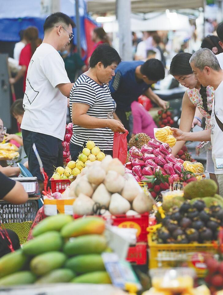 市民游客在新民街外擺水果攤位處購(gòu)買熱帶水果。