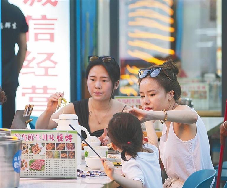 外國(guó)游客在新民街海島鮮生海鮮加工店的外擺攤位就餐。圖片均由記者王程龍攝