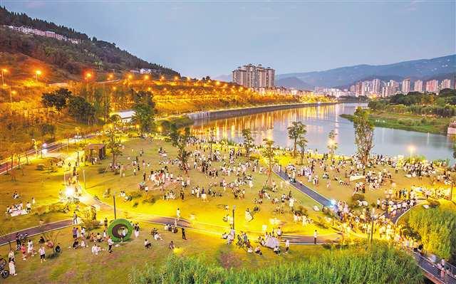 7月13日,夜幕降臨,重慶市開州區(qū)濱湖公園夜色迷人,城市、湖水、草坪相映成趣,吸引眾多市民前來(lái)休閑納涼,樂享綠色健康生活。