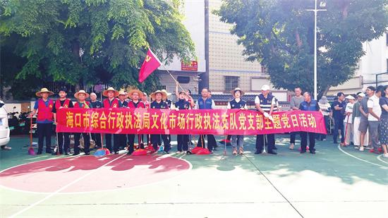 海口市綜合行政執(zhí)法局文化市場行政執(zhí)法支隊開展周末衛(wèi)生大掃除滅蚊活動合影。