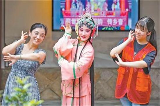 福建省福州市鼓樓區(qū)安泰街道綜合文化站,閩劇演員(中)教授表演技藝。當(dāng)?shù)赝苿?dòng)“古厝+非遺+展演”等多元化發(fā)展,有效傳播閩都“?!蔽幕?,構(gòu)建“15分鐘幸福生活圈”,讓市民和游客感受非遺之美。謝貴明攝(人民視覺(jué))