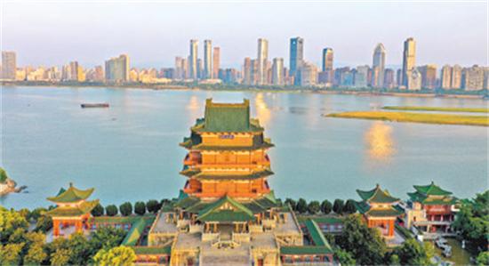 “落霞與孤鶩齊飛,秋水共長(zhǎng)天一色?!苯魇∧喜须蹰w景區(qū)改造升級(jí),一江兩岸風(fēng)景如畫。新華社記者 劉金海攝