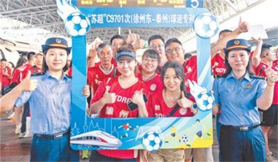 江蘇省城市足球聯(lián)賽(“蘇超”)期間,多部門提供“球迷專列”等便民服務(wù)。城市用精細(xì)服務(wù)傳遞文明理念,市民用高素質(zhì)行為反哺城市形象。圖為球迷乘坐C9701次專列到達(dá)泰州站后留影。湯德宏攝(影像中國(guó))