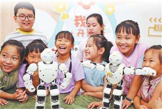 山東省東營(yíng)市東營(yíng)區(qū)辛店街道明珠社區(qū),小朋友學(xué)習(xí)機(jī)器人操作方法。科普教育進(jìn)社區(qū),進(jìn)一步提升居民科學(xué)素養(yǎng)。劉智峰攝(影像中國(guó))