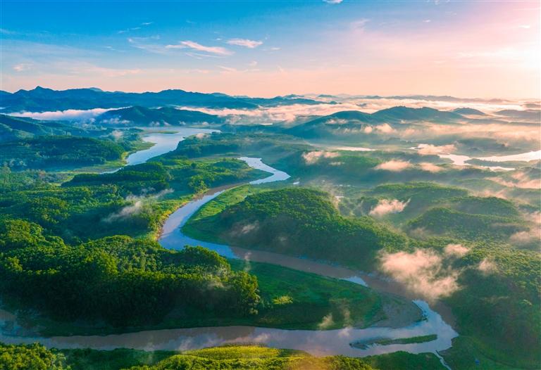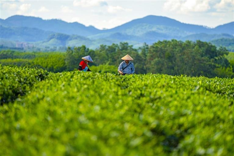 晨霧中的白沙黎族自治縣萬畝茶園,茶香氤氳,綠美宜人,熱帶雨林的生態(tài)綠韻,溪流映著蝶影,仿佛步入一幅生動的山水畫卷。