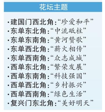 本次長安街沿線布置的立體花壇共10組,東至建國門,西到復(fù)興門,東單、西單路口各布置4組。東單路口4組花壇圍繞銘記歷史、紀(jì)念抗戰(zhàn)勝利主題;西單路口4組花壇展現(xiàn)祖國繁榮、人民幸福場景。其中,東單東北角“中流砥柱”花壇頂高最高,達10.9米。