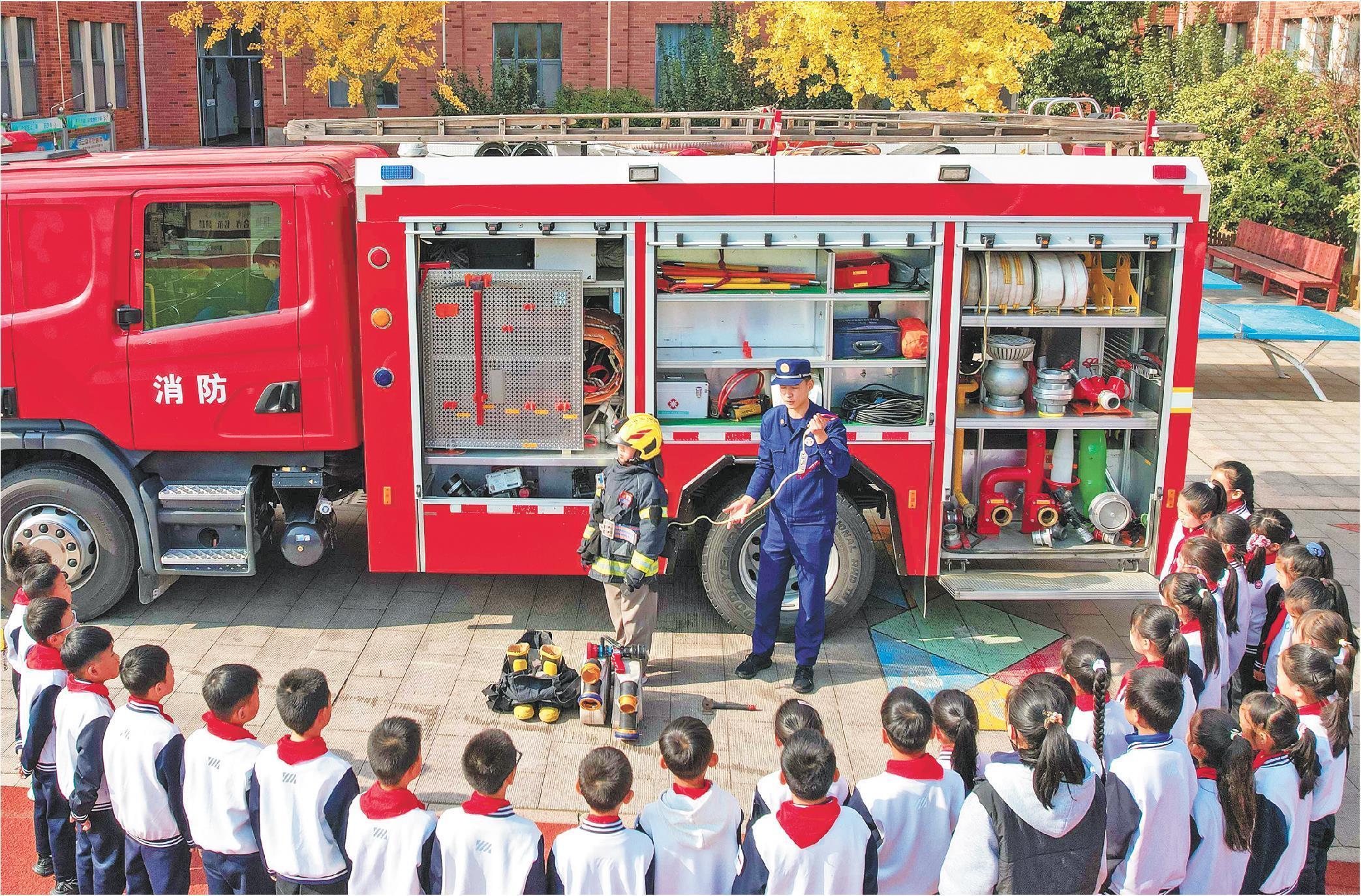 11月7日,消防救援人員為青島升平路小學(xué)學(xué)生講解消防裝備知識(shí)。