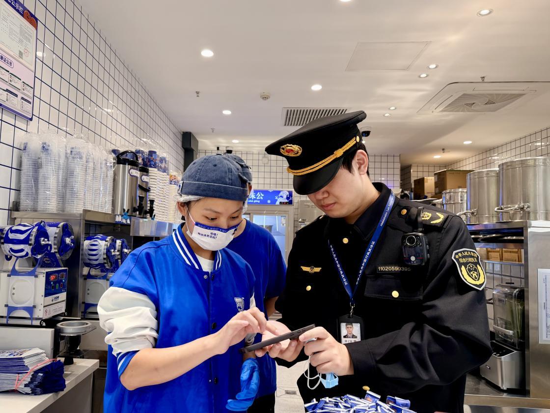 圖為綜合行政執(zhí)法人員在奶茶店進行檢查指導(dǎo)