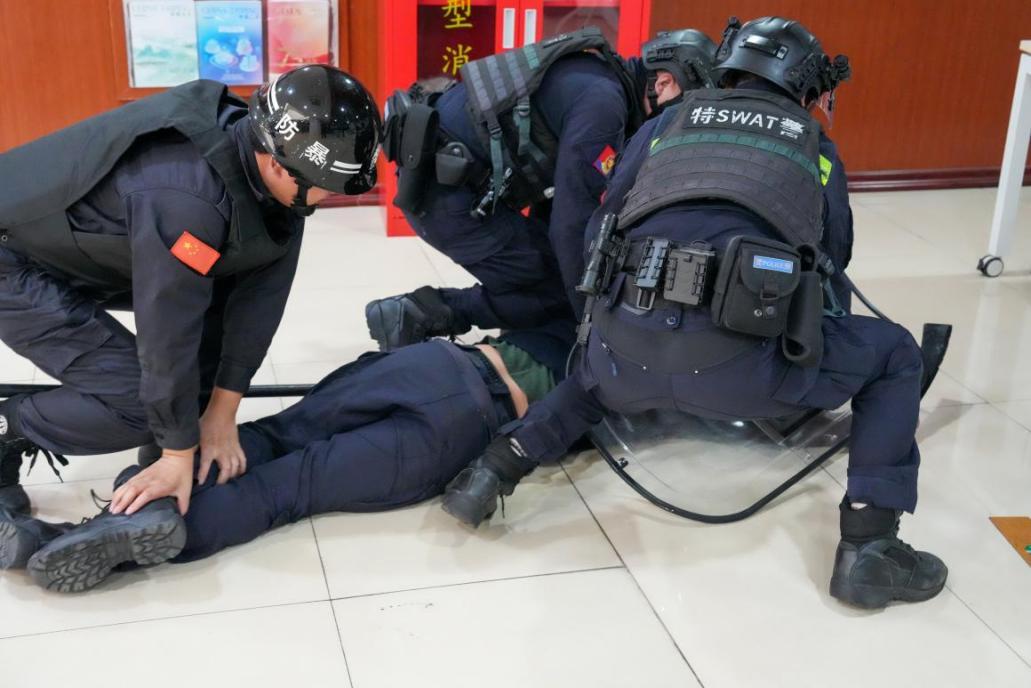 實戰(zhàn)模擬環(huán)節(jié)以“商業(yè)中心發(fā)生個人極端事件”為預設場景,全程模擬真實應急處置流程。安保人員第一時間通過可視對講機報警,派出所指揮中心接報后,迅速開展應急調度,指揮該商業(yè)中心的物業(yè)保安組成“最小應急單元”,率先趕到現(xiàn)場展開先期處置。與此同時,啟動“就近互助”聯(lián)防機制——鄰近商圈、步行街的物業(yè)安保力量在接到指令后,快速攜帶裝備奔赴現(xiàn)場增援。巡特警大隊PTU則在最短時間內(nèi)抵達,以專業(yè)的戰(zhàn)術素養(yǎng)與現(xiàn)場處置力量協(xié)同配合,高效穩(wěn)妥地處置了模擬警情。派出所民警同步完成接處警后續(xù)工作,實現(xiàn)了從報警到處置完畢的全流程閉環(huán)。整個處置過程緊張有序,有效檢驗了最小應急單元的快速反應與協(xié)同作戰(zhàn)能力。