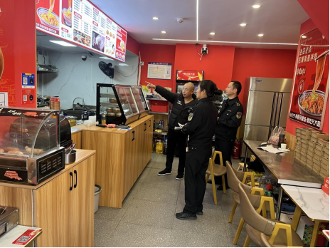 圖為執(zhí)法人員對(duì)商戶進(jìn)行指導(dǎo)