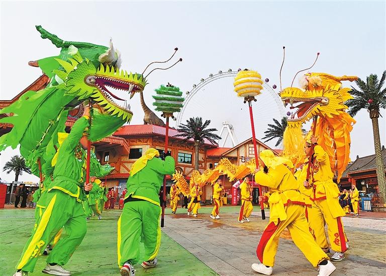 1月1日,一支民間舞龍隊(duì)在沁陽(yáng)市懷府恐龍園游客廣場(chǎng)進(jìn)行舞龍表演,迎新年,度元旦。楊帆攝