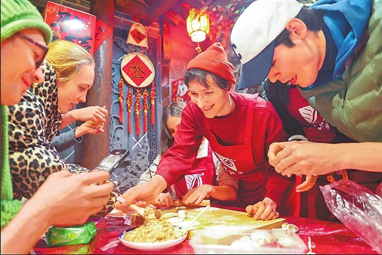 1月1日,三門(mén)峽市一家酒店內(nèi),來(lái)自俄羅斯的游客在專(zhuān)業(yè)廚師的指導(dǎo)下,體驗(yàn)中國(guó)傳統(tǒng)美食餃子的制作過(guò)程。孫猛攝