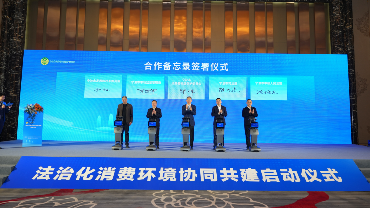 儀式上,寧波市消保委、市中級(jí)人民法院、市發(fā)展和改革委員會(huì)、市司法局、市市場監(jiān)督管理局五部門共同簽署《關(guān)于構(gòu)建法治化消費(fèi)環(huán)境協(xié)同保護(hù)機(jī)制合作備忘錄》,該協(xié)同機(jī)制正式建立。