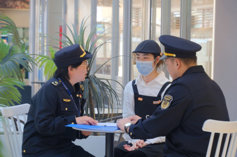 圖為執(zhí)法人員在餐飲店開展聯(lián)合檢查服務(wù)